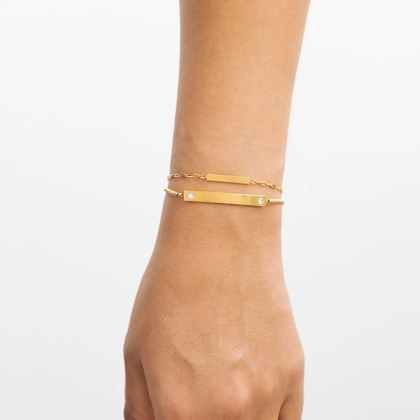 This custom bar bracelet features an “NSB” engraving—our beloved New Smyrna Beach—adding a personal and stylish touch to a classic design. Crafted from waterproof stainless steel with 18K gold plating and set with sparkling CZ stones, it's both durable and dazzling. The adjustable toggle slider chain ensures a perfect fit every time, making it easy to stack or wear solo.