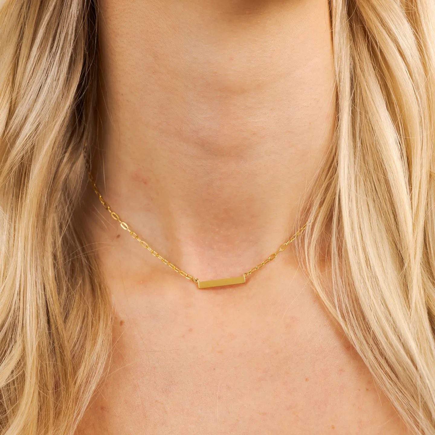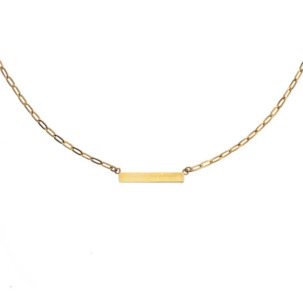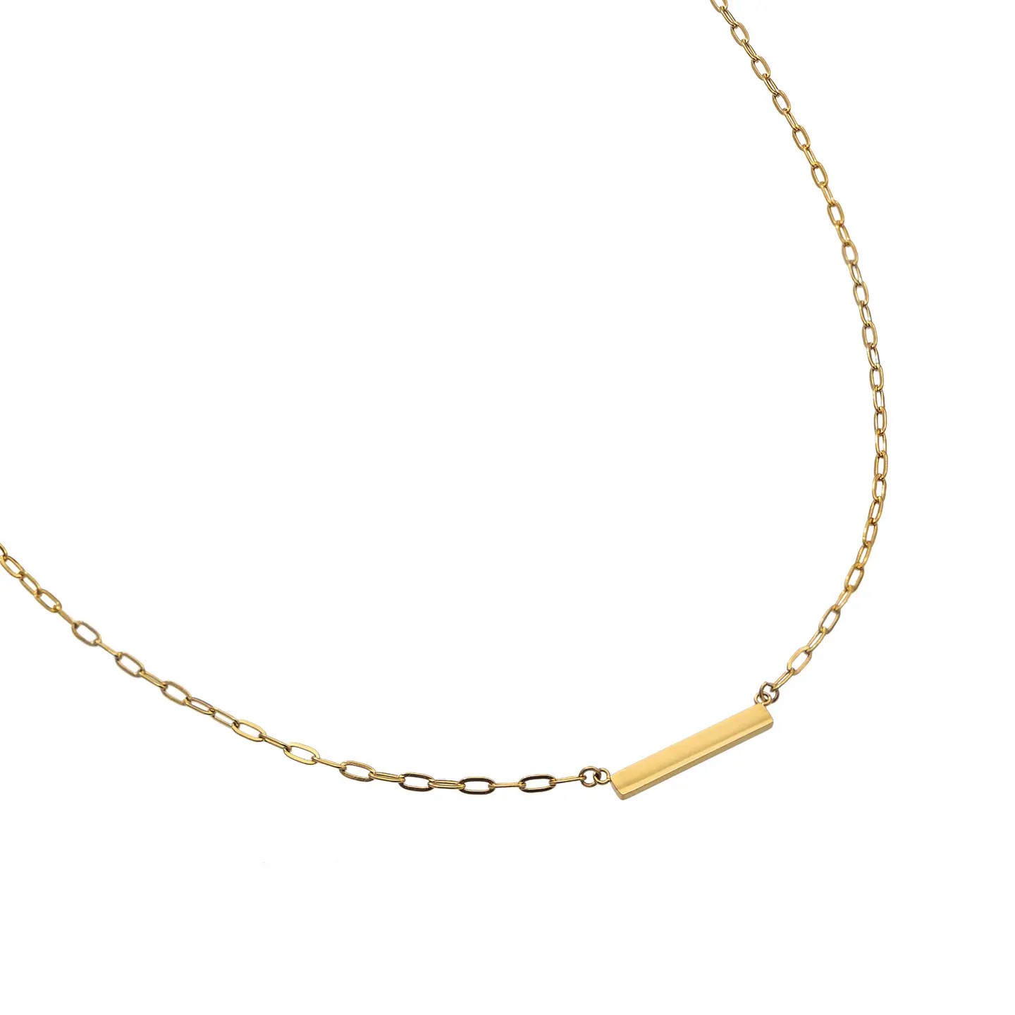 Our Custom Mini Bar Necklace with Paperclip Chain is designed for simplicity and everyday elegance. The sleek bar can be engraved for a personalized touch, while the on-trend paperclip chain adds a modern edge. Crafted from waterproof stainless steel and plated in 18K gold, this piece is hypoallergenic, nickel-free, and made to last. Its compact size makes it perfect for layering or wearing solo as a subtle statement.