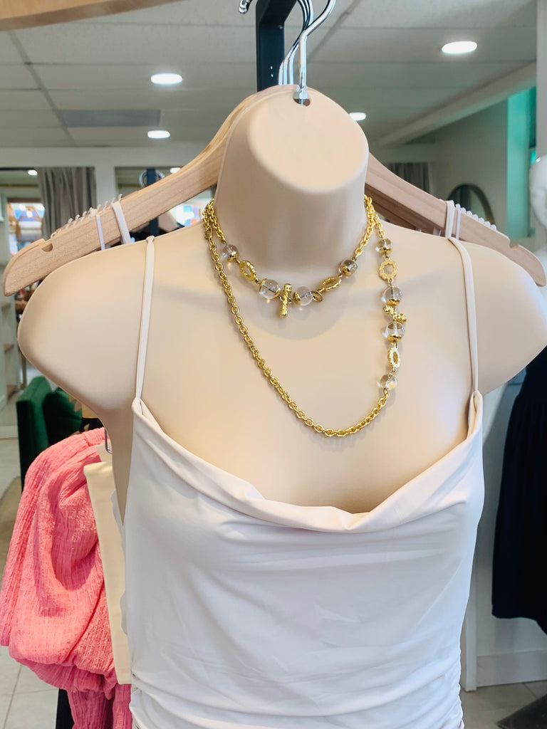 Vintage Layered Gold Chain Necklace with Clear Beads and Charms