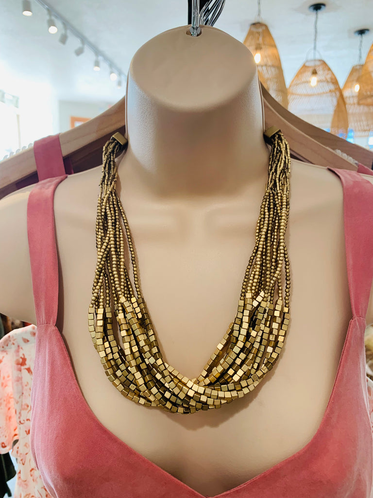 Vintage Layered Matte Gold Cube Bead Statement Necklace