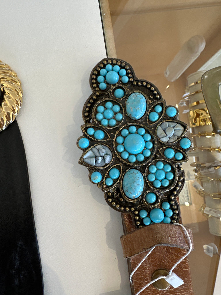 Vintage Leatherock Boho Leather Belt with Ornate Circle Buckle – Coral & Turquoise Studs