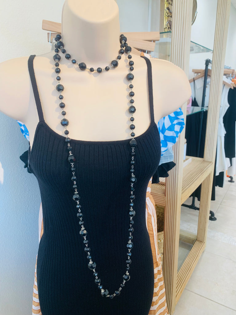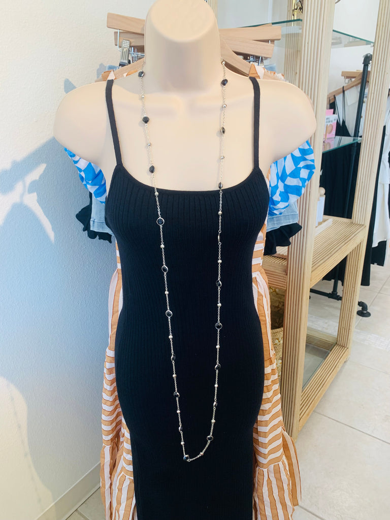 Vintage Long Silver Chain Necklace with Black Bead Accents