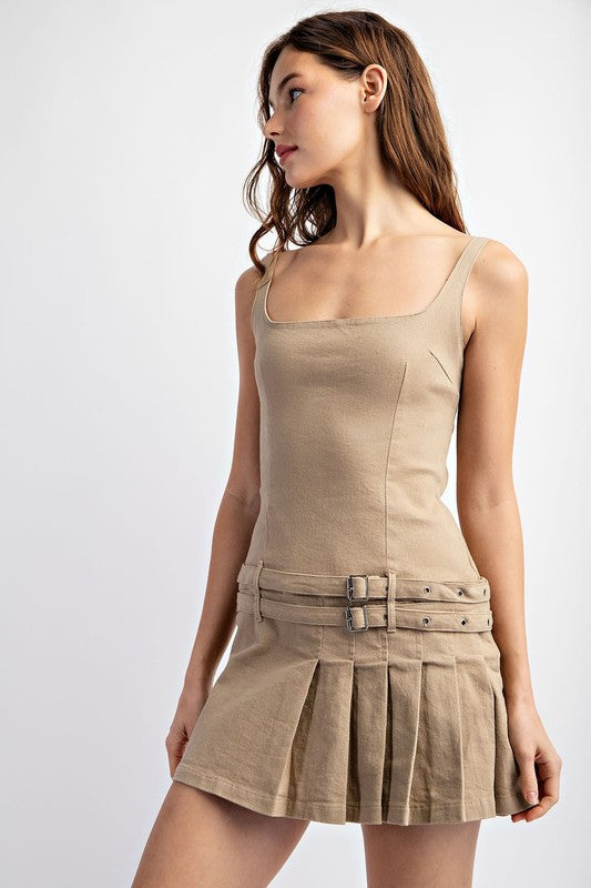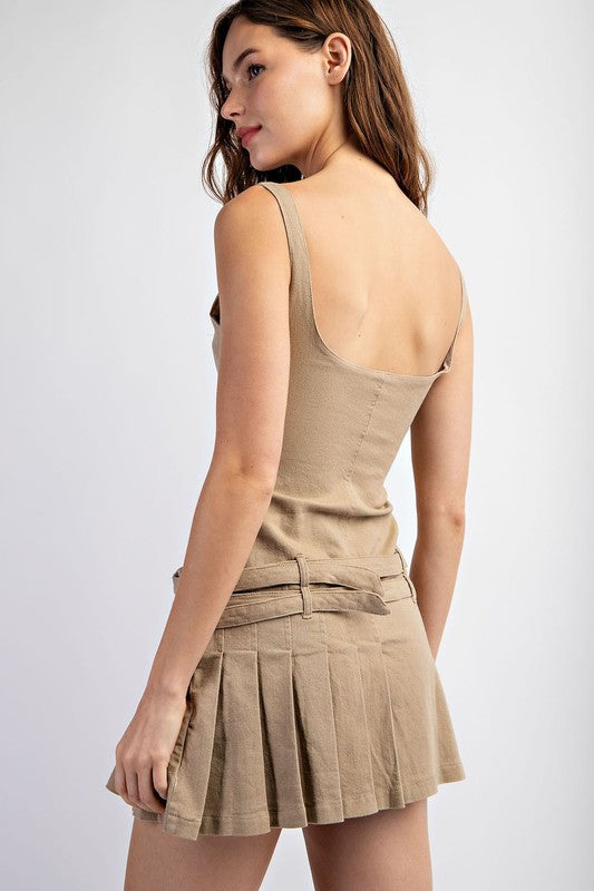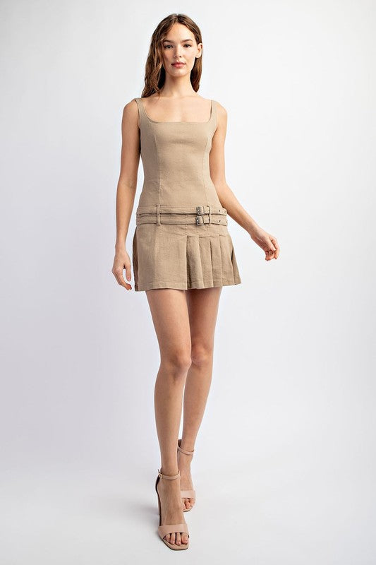 Structured, sleek, and undeniably chic. This mini dress features a square neckline with wide tank straps for a modern edge, while the fitted bodice and double-belt waist detail create a flattering, cinched silhouette. The pleated mini skirt adds playful movement, balanced by a daring low scoop back and hidden zipper closure. Effortlessly blending bold style with sophistication, it’s the perfect dress for a night out.
