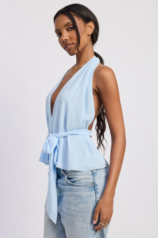 Blue Halter Backless Wrap Top