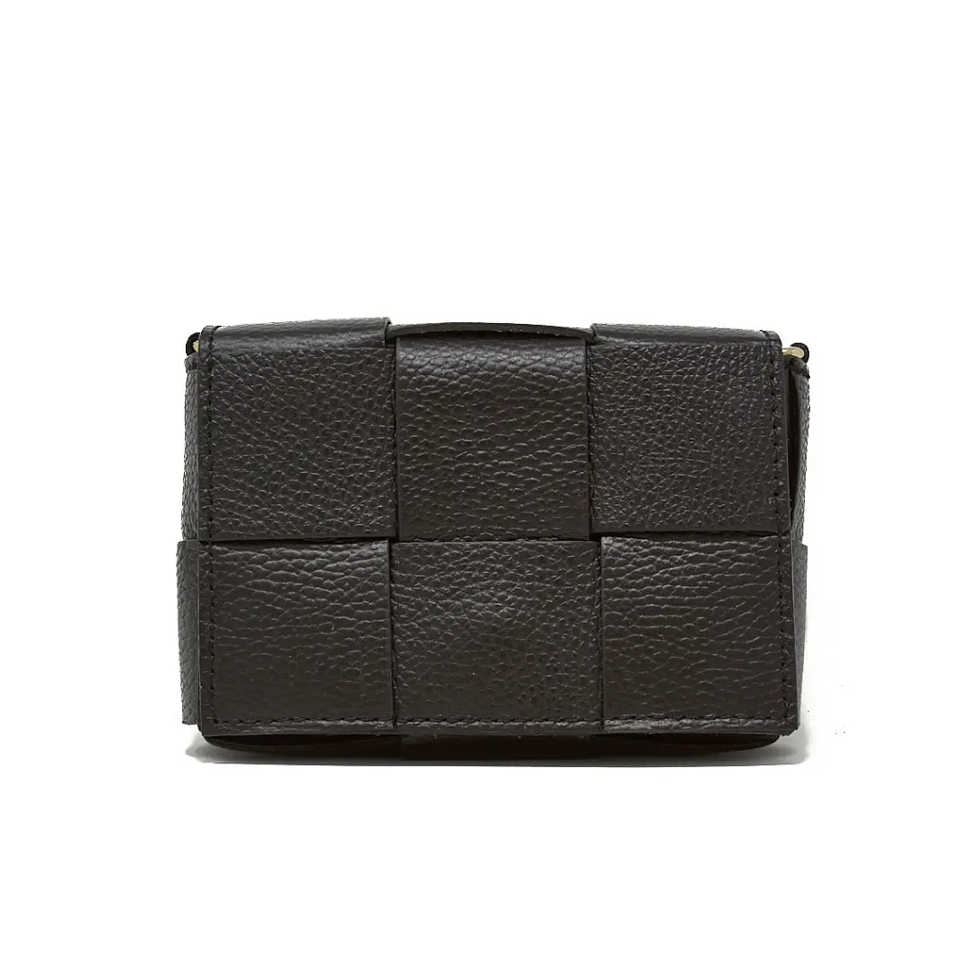 Black Woven Genuine Italian Leather Crossbody Bag made of genuine Italian leather, featuring a braided design and gold hardware. The removable and adjustable crossbody strap makes it versatile and practical for everyday use. The foldover front snap closure provides secure storage for your essentials. Measurements: 6''W x 4.5'H x 2''D