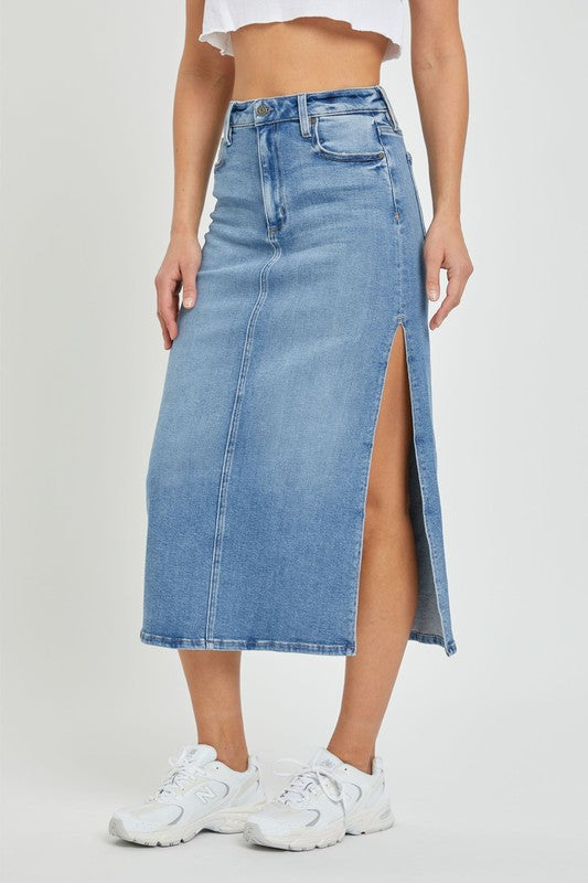 Elevate your everyday style with this classic denim midi skirt. Designed with a timeless straight cut and a flattering mid-rise fit, this skirt combines comfort and versatility. Featuring a front button-and-zip closure, belt loops, and functional five-pocket styling, it offers the perfect balance of casual and chic. The side slit detail adds a modern twist, making it easy to move while giving your outfit a touch of edge.