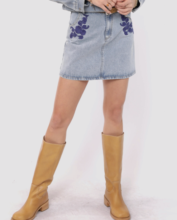 Most Likely Embroidered Denim Skirt - XS is backordered and will ship as soon as it is back in stock.
