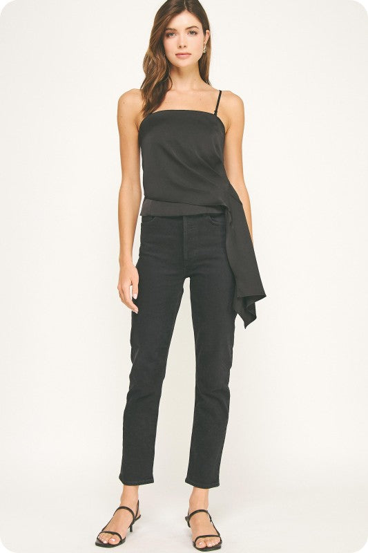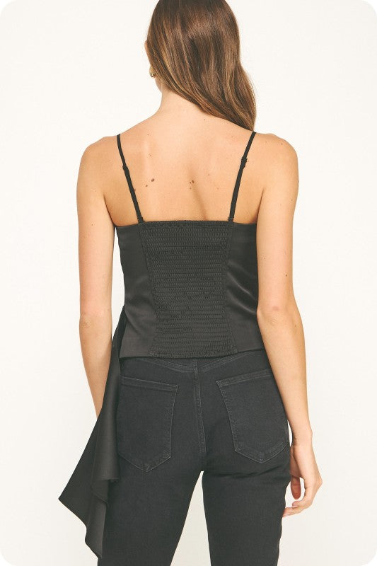 Sleek and sculpted, this satin corset top is designed with a draped pleat waterfall side panel for a statement finish. Featuring a bustier silhouette with removable adjustable straps, stretch smocking at the back for comfort, and a hidden zipper closure. Wear it strapless or with straps for versatile styling.