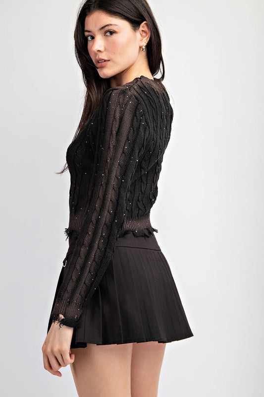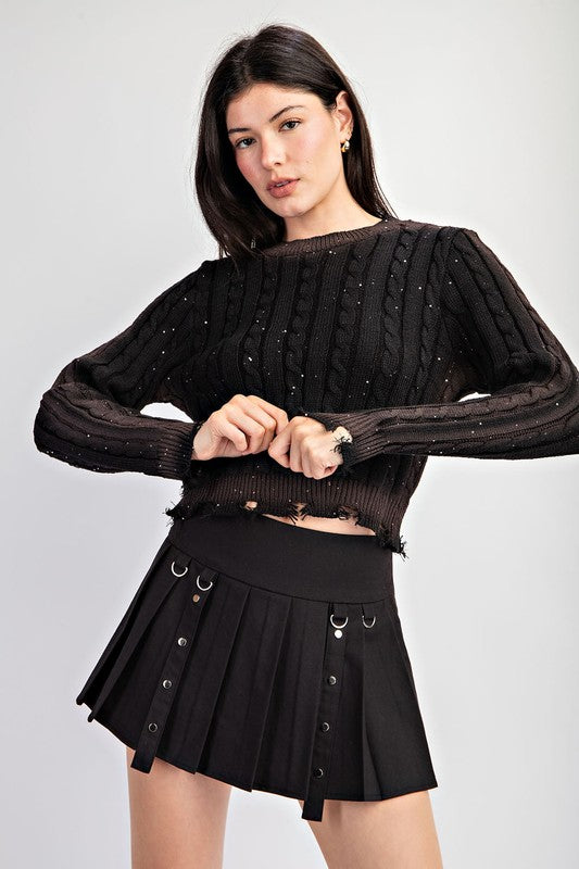 Black Two Tone Cable Sweater Knit Top W Destroyed