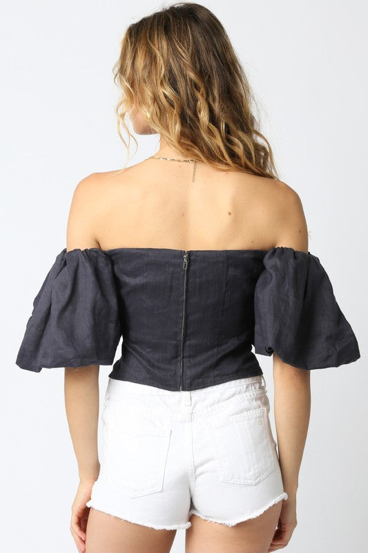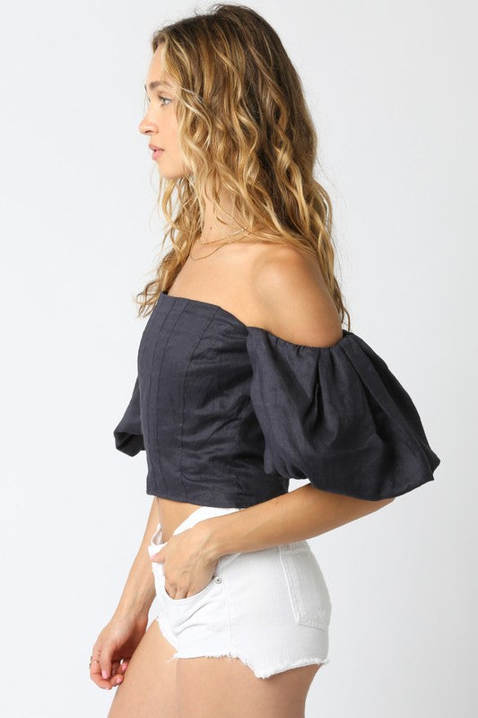 Make a dramatic entrance with this Off-Shoulder Puff Sleeve Crop Top. Featuring voluminous balloon sleeves and a structured, square neckline, this top is a bold take on romantic styling. Crafted from breathable linen, it offers a flattering cropped fit that pairs effortlessly with high-rise jeans, shorts, or skirts for a statement look perfect for warm-weather outings.