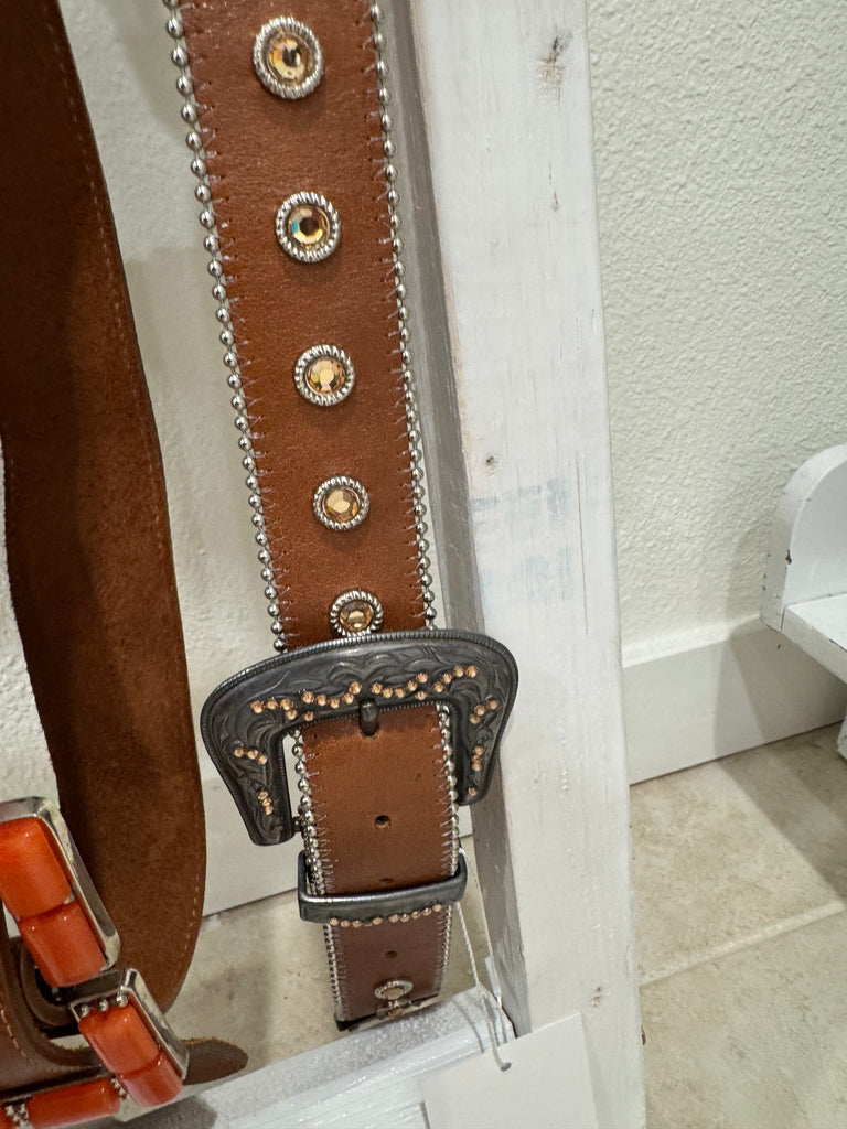 Vintage Brown Leather Belt with Orange Stone Detailing