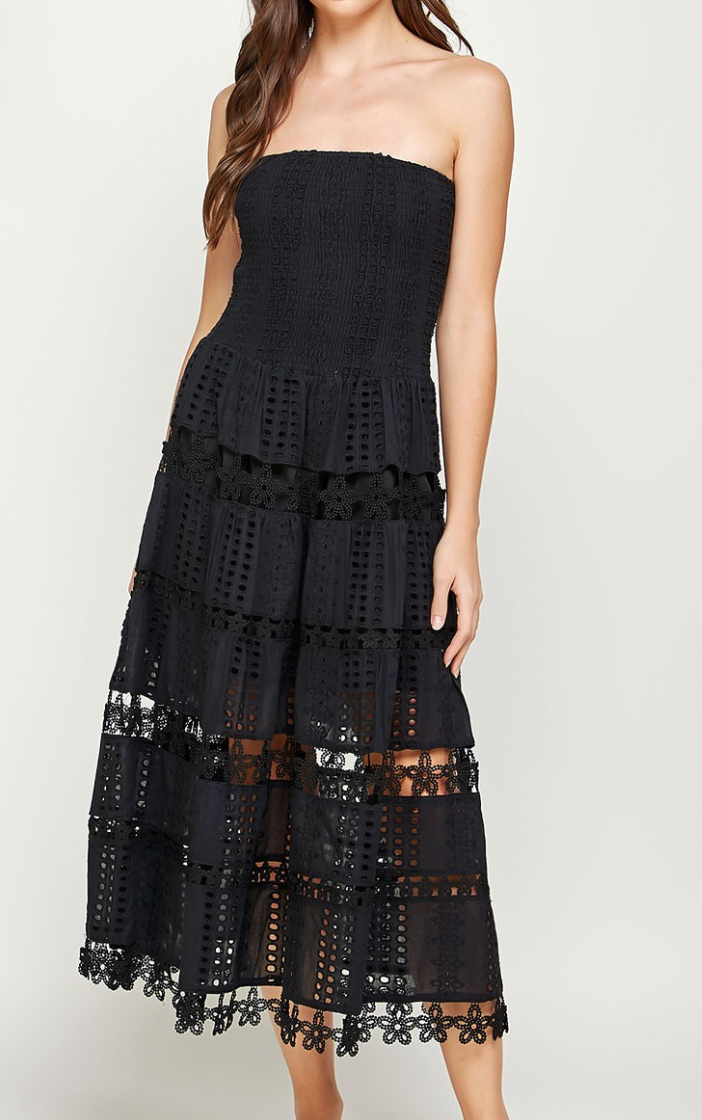 Black Eyelet Strapless Midi Dress