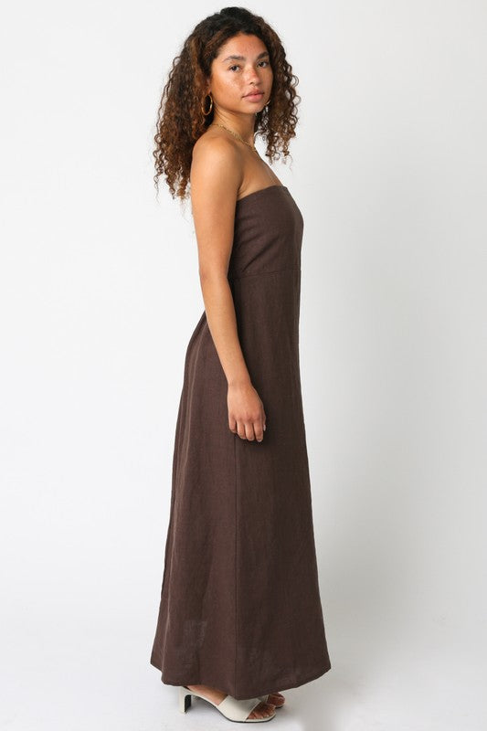 Simplicity meets sophistication in this effortlessly chic Brown Linen Strapless Maxi Dress. Crafted from breathable linen, it features a clean, strapless neckline and a softly structured silhouette that flows into a full-length hem. The rich cocoa hue adds a touch of earthy elegance, making it perfect for both casual summer days and elevated evenings. Pair it with statement earrings and sandals for a look that’s timeless, modern, and endlessly wearable.