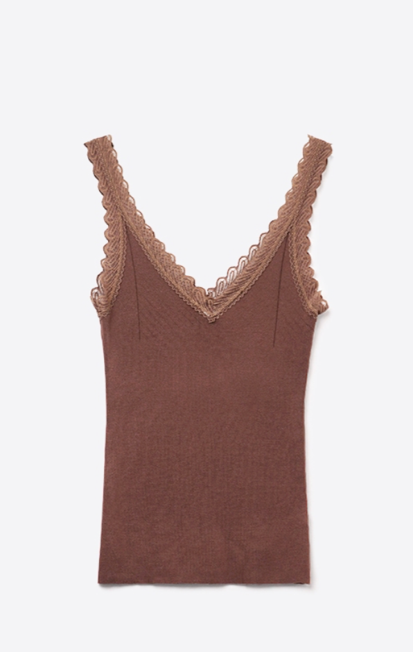Introducing the Scoop Neck knitted Lace Trim Tank Top designed from high-quality chocolate brown ribbed knitted fabric that offers both softness and durability. This tank top features an elegant scoop neckline and delicate lace trimming around the edges adding a touch of femininity to your wardrobe. Perfect for layering or wearing on its own this versatile piece is ideal for any occasion whether you're dressing up for a night out or enjoying a casual day.