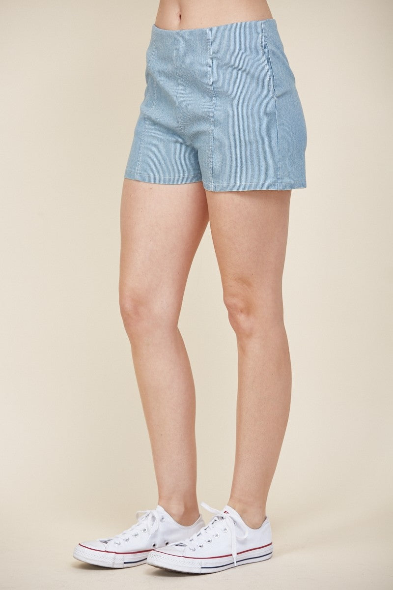 Comfortable and casual chic stretch denim shorts featuring subtle vertical stripes.  Designed with a clean, tailored fit and side pockets, these shorts are perfect for a laid-back yet stylish look.