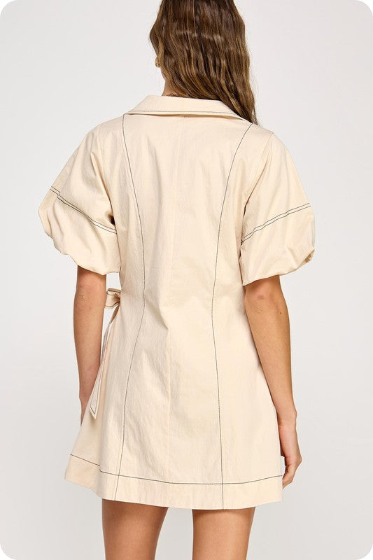 Effortless and refined, the Top Stitch Wrap Mini Dress is cut from a soft stretch cotton blend. Featuring contrast top-stitch detail, a surplice V-neck with spread collar, playful bubble sleeves, and a flattering side-tie wrap silhouette — fully lined for the perfect finish.