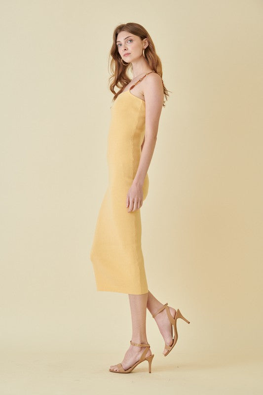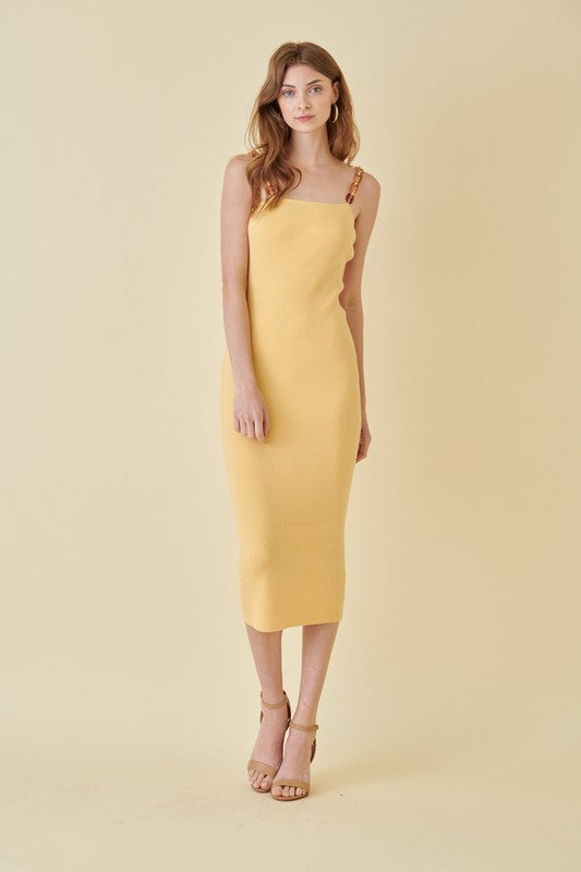 Chic meets statement in this sunshine-hued bodycon midi dress. Crafted from a ribbed stretch knit that hugs your curves in all the right places, this sleek silhouette features a square neckline and eye-catching tortoise shell chain straps that add a bold, modern twist. Whether you're heading to a summer soirée or a rooftop dinner, this dress brings the perfect blend of elegance and edge.