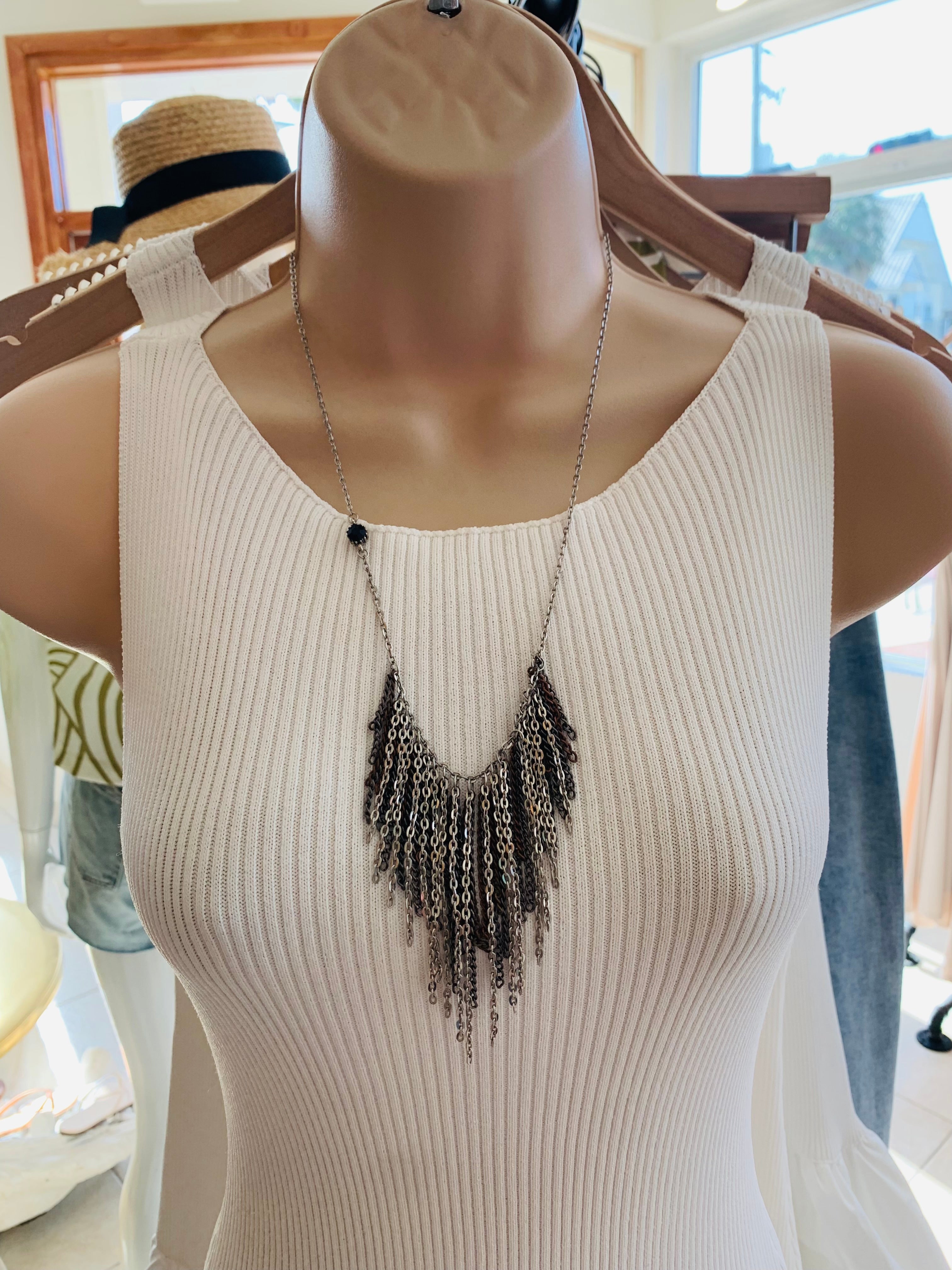 Unleash your inner edge with this dramatic gunmetal fringe necklace. Featuring cascading layers of fine chains in a V-shaped silhouette, this statement piece adds instant attitude and texture to any outfit. The dark metallic finish offers a bold, modern aesthetic that’s perfect for nights out or elevating everyday looks.