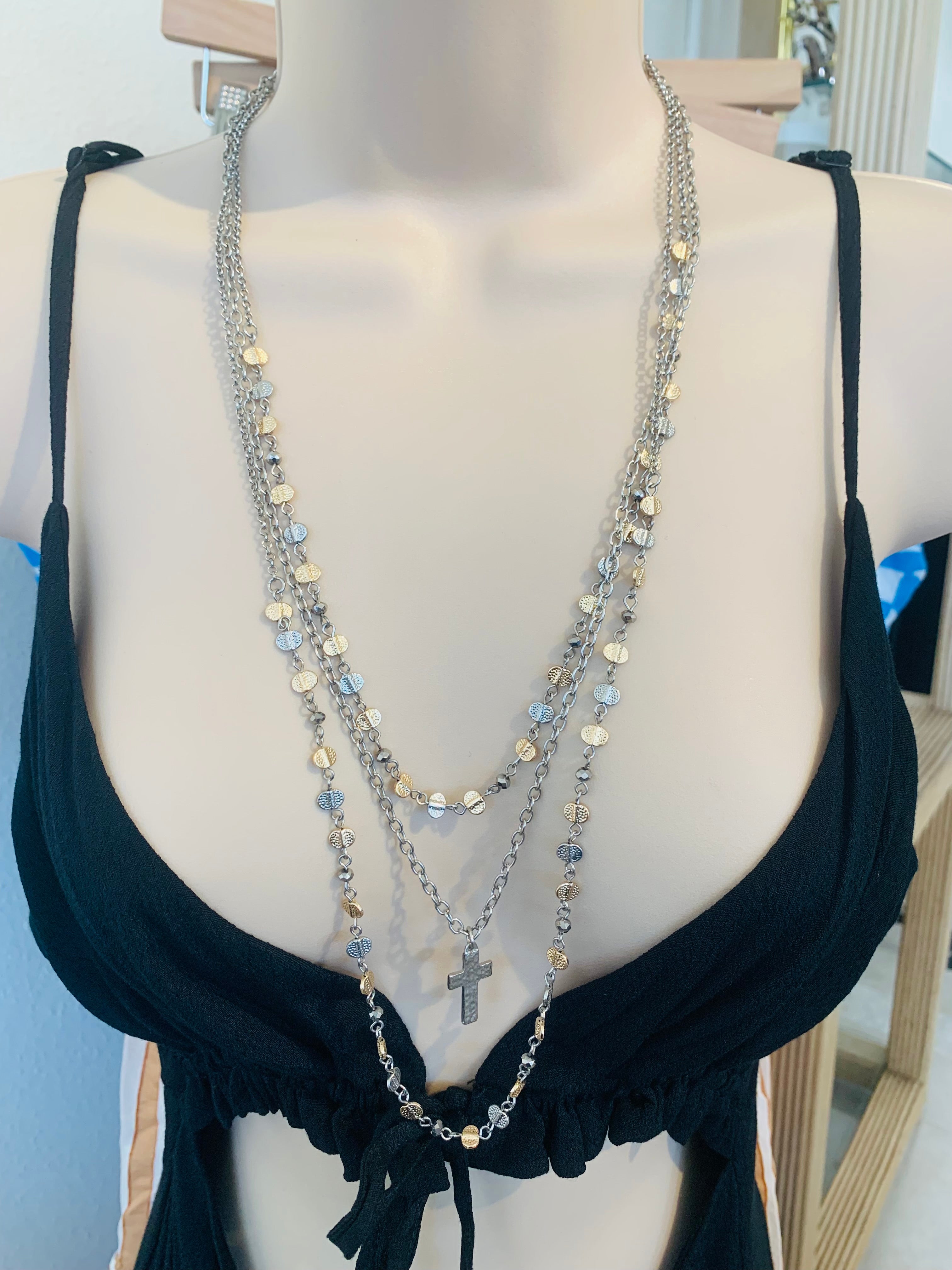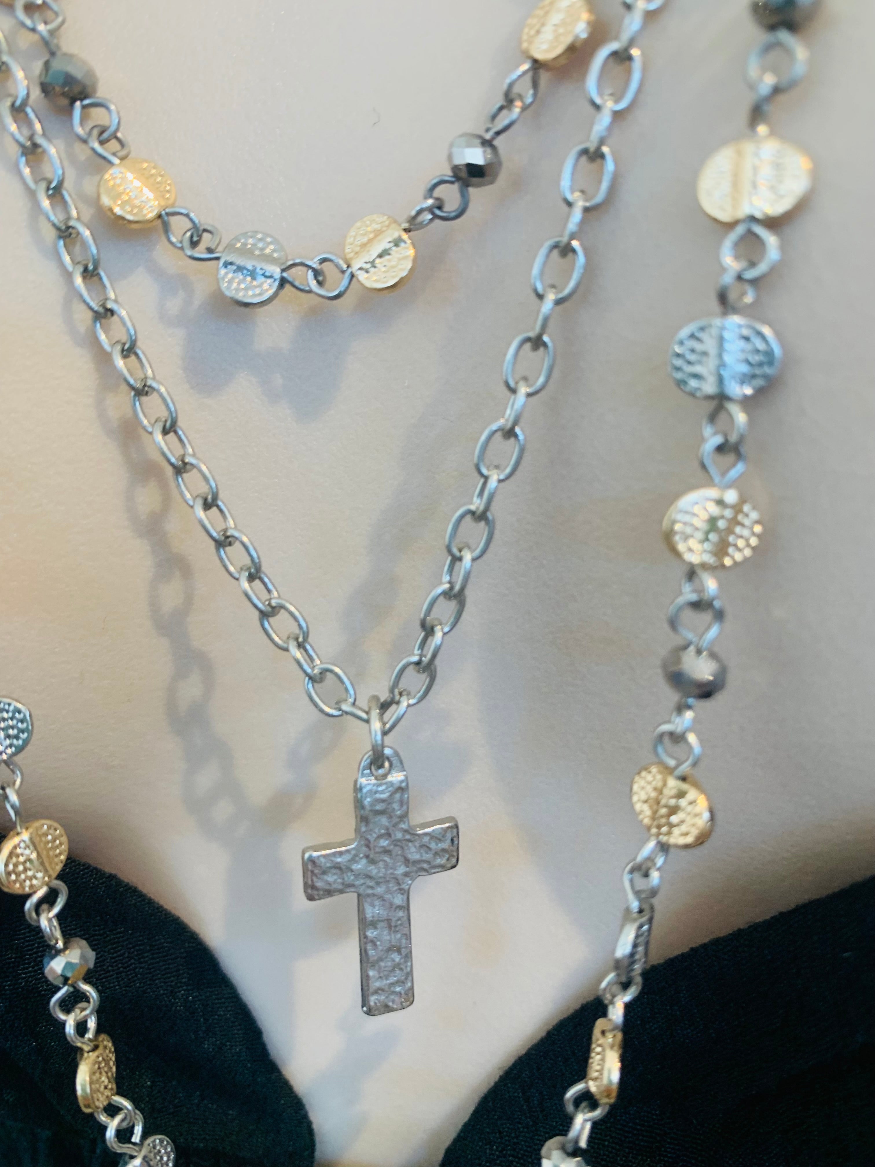 Make a meaningful style statement with this Layered Silver & Gold-Tone Chain Necklace. Featuring multiple strands of delicate chains adorned with mixed metallic discs and a central silver cross pendant, this piece brings together elegance and symbolism. The mixed metals offer versatile styling, perfect for everyday wear or dressing up your favorite looks with a touch of faith-inspired charm.