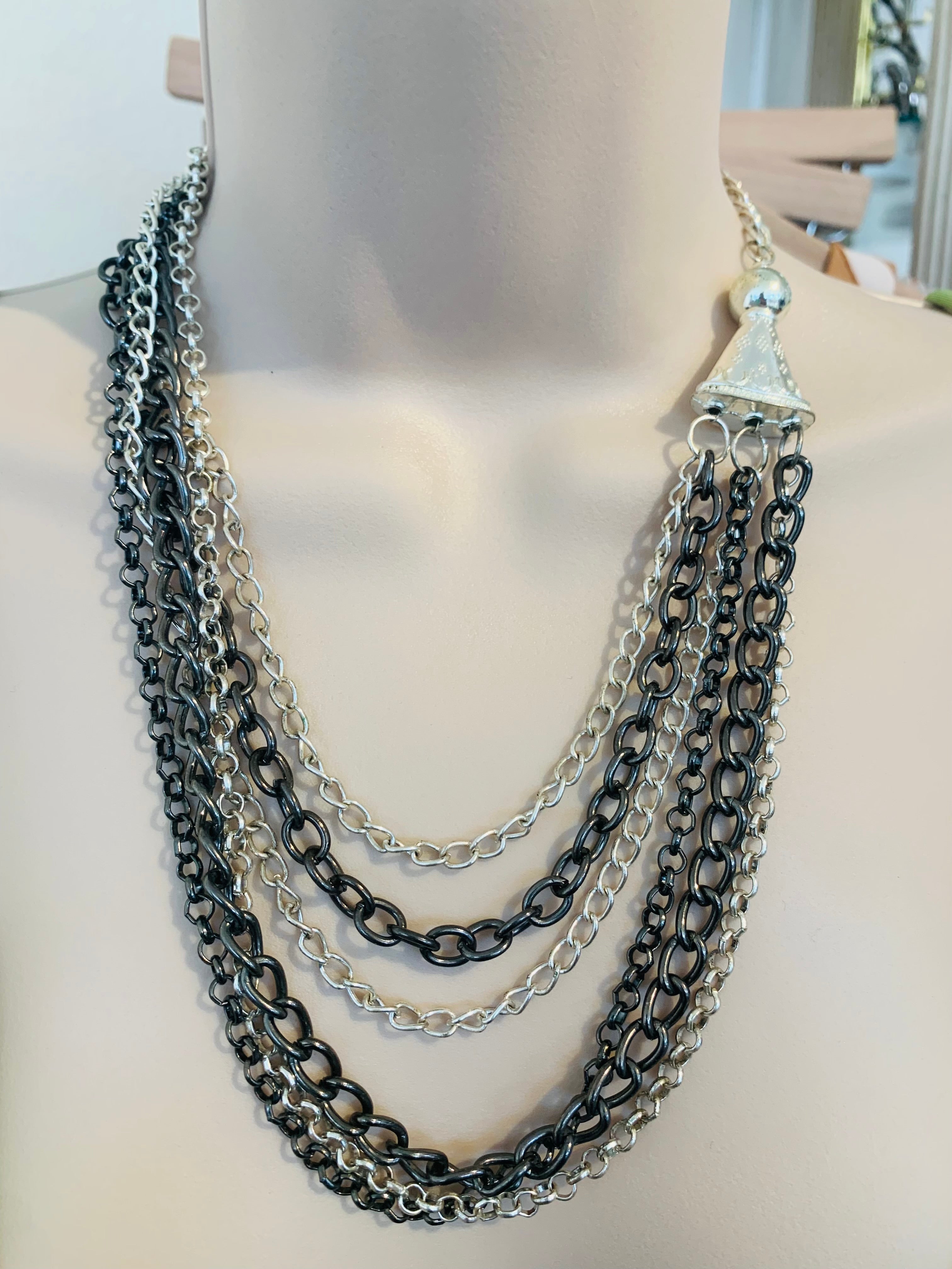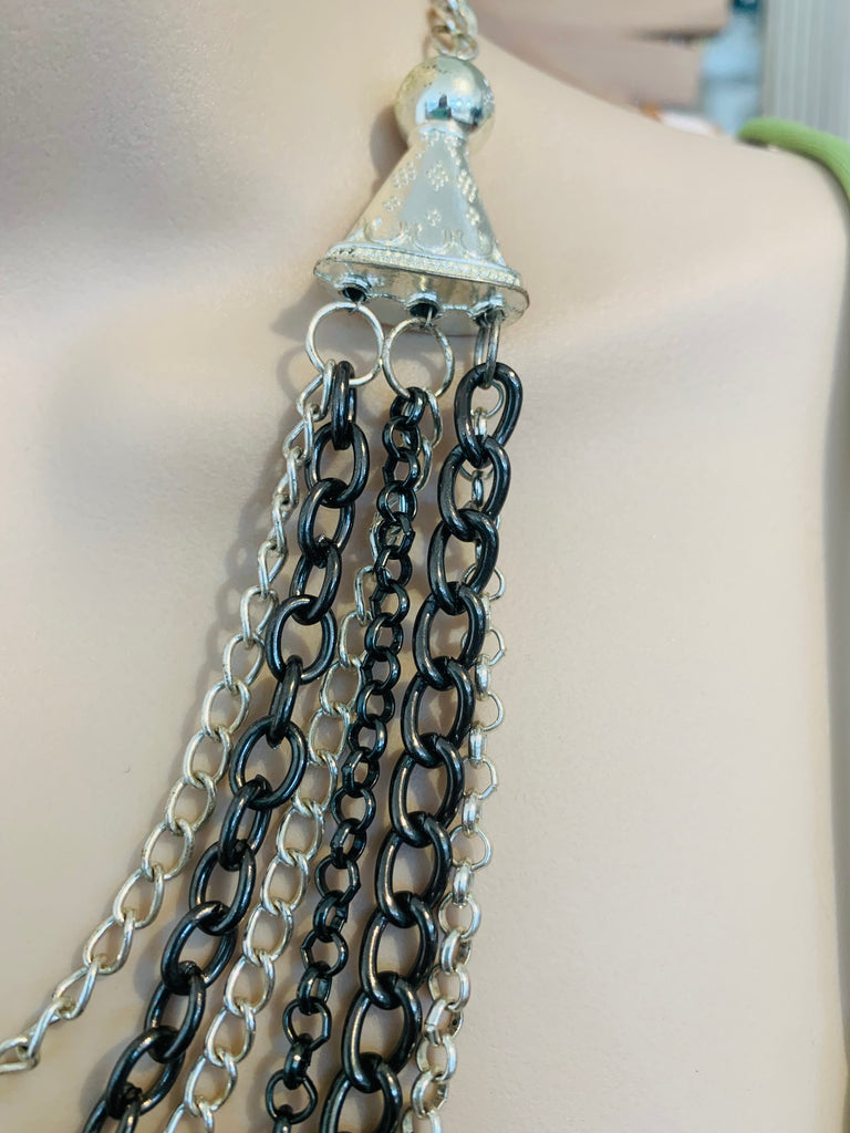 Vintage Multi-Strand Black & Silver Chain Bib Necklace